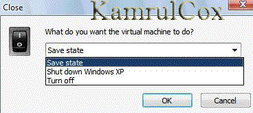 সেটাপের অর্ধেক পথে যদি বিদ্যুৎ চলে যায় বা কোন গুরুত্বপূর্ণ কাজ পড়ে যায় তাহলে ভয় নেই। উপরের ডান পাশে x চিহ্নতে ক্লিক করুন। নিচের মত মেসেজ আসবে।ওখানে থেকে Save State এ ক্লিক করুন। কিছুক্ষণের মধ্যে বর্তমান অবস্থাটা সেভ করে ভার্সুয়াল পিসি ক্লোজ হয়ে যাবে। এবার বাকি উইন্ডোটা ক্লোজ করে আপনার Host PC (অরজিনাল পিসি) বন্ধ/শাট ডাউন করে দিতে পারেন। যখন আবার সময় পাবেন তখন Microsoft Virtual PC সফটওয়ারটি রান করুন এবং Start এ ক্লিক করুন।