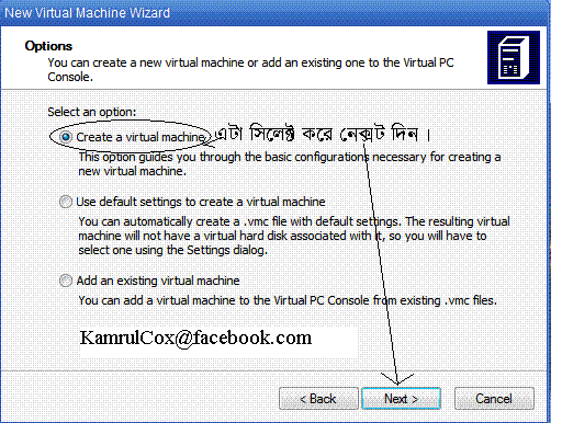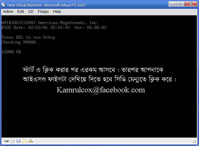 এবং ৫১২ মেঃবাঃ র্যামের দরকার হবে। MS Virtual PC তে উইন্ডোজ সেটাপ দেয়ার পর ঐটি হবে আপনার আরেকটা পিসি। অর্থাৎ একের ভিতর দুই। আপনার দুটো পিসিই একসঙ্গে চালাতে পারেন কোন সমস্যা ছাড়াই। যেমন আমি আমার ব্রডব্যান্ড লাইনের মধ্যে Host PC (আমার অরজিনাল পিসি যেটা) তে ডাউনলোড দেয়ার পর যখন কোন কিছু ব্রাউজ করলে স্পীড কমে যায়। তখন আমি আমার Guest PC (ভার্সুয়াল পিসি) তে ব্রাউজ করি। এতে স্পীডের কোন সমস্যা হয়না। এখন দেখি ভার্সুয়াল পিসি কিভাবে সেটাপ দেবেন আর কাজ করবেন। নিচের ছবিগুলোতে বর্ণনা আছে। এক ঝলকে ছবিগুলো দেখে নিন। ছবিতে ক্লিক করলে ছবিগুলো বড় হবে। প্রয়োজনে সেভ করে রাখুন আর ভার্সুয়াল পিসি ডাউনলোড করে এখ্নই প্রাকটিস শুরু করে দিন।