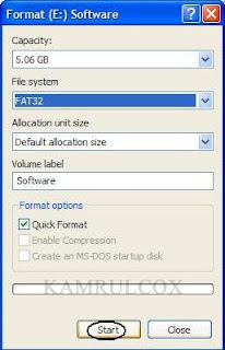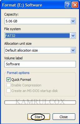 File System এর নিচে আপনি পছন্দমত FAT32 বা NTFS সিলেক্ট করে দিন। Volume label এর নিচে আপনি যে নামটি দেবেন তা ড্রাইভের নাম হিসেবে দেখা যাবে। Quick Format এ ঠিক চিহ্ন দিলে ফরমেট তাড়াতাড়ি হবে অন্যথায় নরমাল ফরমেট হবে। নরমাল ফরমেটে সময় লাগবে বেশি। তাছাড়া এটি সাধারণত ব্যবহার করার দরকার হয় না। অপশনগুলো পছন্দমত দিয়ে নিচের Start বাটনে ক্লিক করুন।