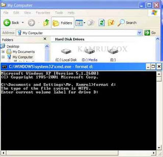 আমরা এখানে /q সুইচটি ব্যবহার করি নি। এই সুইচটি ছাড়া একবার ট্রাই করে দেখি। এর ফলে ড্রাইভটি নরমাল ফরমেট হবে। তাছাড়া আমরা এখানে /fs: সুইচটিও ব্যবহার করি নি। কারণ ড্রাইভটি বর্তমানে ntfs এ আছে। যদি নতুন ড্রাইভ হতো (আগে ফরমেট করা হয় নি) তাহলে /fs: সুইচটিও অবশ্যই ব্যবহার করতে হতো। তাই /fs: সুইচ ব্যবহার না করার ফলে ড্রাইভটি ফরমেট হয়ে ntfs এই থেকে যাবে। আর শেষের d: হল আমরা d ড্রাইভ ফরমেট করবো। যেকোন ড্রাইভের পরই : দিতে হয়।