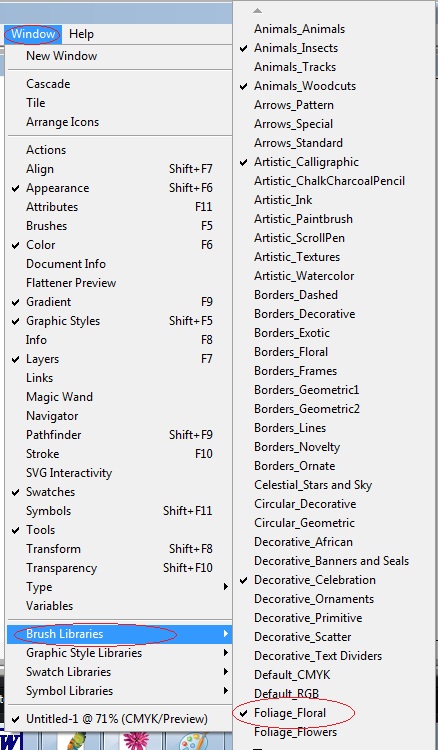 আমরা বিভিন্ন গুলো পাব মেনু বারের Windows হতে Brush libraries এবং Graphic style libraries এবং symbol libraries যে কোনটি থেকে আমরা চয়েস করে নিতে পারি