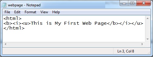 এবার এটাকে webpage.html নামে সেভ করুন এবার সেভ করা ফাইলটি অন করুন দেখুন This is my first web page এই লেখাটি Bold, Italic, Underline এবং Center হয়ে সো করছে….