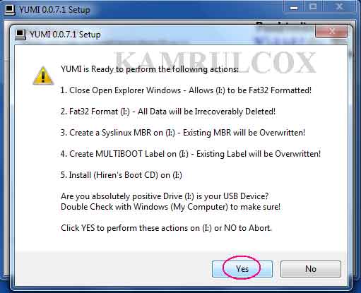 ৫। নিচের মত মেসেজ আসবে। মেসেজটিতে বলা হচ্ছে যে- “আপনার পেনড্রাইভটি Format হবে এবং পেনড্রাইভের সমস্ত ডাটা মুছে যাবে যা ফিরিয়ে আনা সম্ভব হবে না। Format শেষে আপনার ফাইলটি এড হবে। আপনি কি তাতে রাজি?” গুরুত্বপূর্ণ ডাটা থাকলে তা আগে সরিয়ে নিয়ে Yes এ ক্লিক করুন।