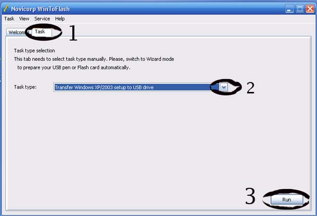 এরপর Task এ ক্লিক করে Trasfer windos xp/2003 setup to USB drive এ সিলেক্ট করুন এরপর নিচে Run এ ক্লিক করুন
