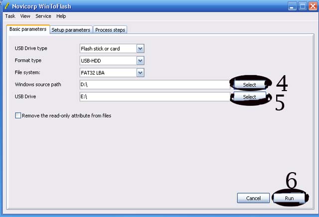 এখন সব অপশন ঠিক রেখে Windows source path এ আপনার এক্সপির ফোল্ডার দেখিয়ে দিন। USB drive এ পেনড্রাইভ লোকেশন দেখিয়ে দিন, run এ ক্লিক করুন