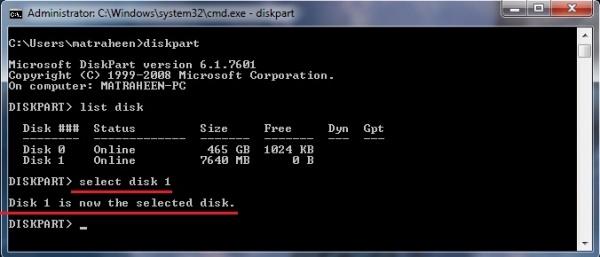 03) এখন আপনার নির্দিস্ট ফ্ল্যাস ড্রাইভটিকে সিলেক্ট করতে হবে। যদি আপনার Flash Drive টি Disk 1 হয় (এখানে আমার ফ্ল্যাস ড্রাইভ Disk 1, তাই এটি দিয়েই আমি বুঝাচ্ছি) তাহলে টাইপ করুন Select disk 1 > Enter চাপুন। Disk 1 is now the selected disk এই লেখা আসবে।