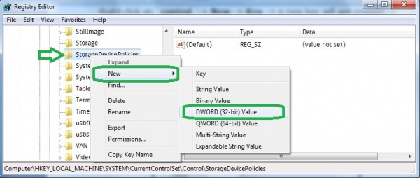 যদি আপনি StorageDevicePolicies খুজে না পান তবে Control এ মাউসের রাইট বাটন ক্লিক করে New > Key সিলেক্ট করুন। এবং StorageDevicePolicies দ্বারা Rename করুন।