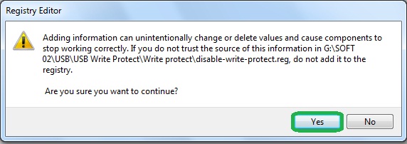 ডাউনলোড হয়ে গেলে Zip ফাইলটি এক্সট্রাট করুন, সেখানে disable-write-protect ও enable-write-protect নামে দুইটি রেজিস্ট্রি ফাইল পাবেন। ফ্ল্যাস ড্রাইভ Write Protect Enable করতে চাইলে enable-write-protect ফাইল টিতে অথবা ফ্ল্যাস ড্রাইভ Write Protect Disable করতে চাইলে disable-write-protect ফাইলে ডাবল ক্লিক করুন। নিচের মত একটি কনফার্মেশন উইন্ডো ওপেন হবে, Yes ক্লিক করুন।