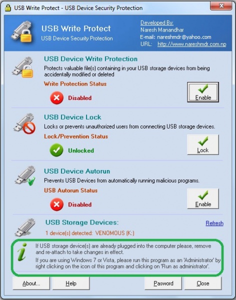 ১. এই সফটওয়্যারটির নাম USB Write Protect – USB Device Security Protection. এর সাহায্যে আপনি শুধু Write Protection Enable/Disable ই না, USB Device Lock এবং USB Device Autorun কন্ট্রোল করতে পারবেন। নিচের চিত্রে দেখুন। সফটওয়্যার টি ওপেন করে চিত্রের সবুজ বক্স করা অংশের লেখাটুকু অবশ্যই পড়ে নিবেন।