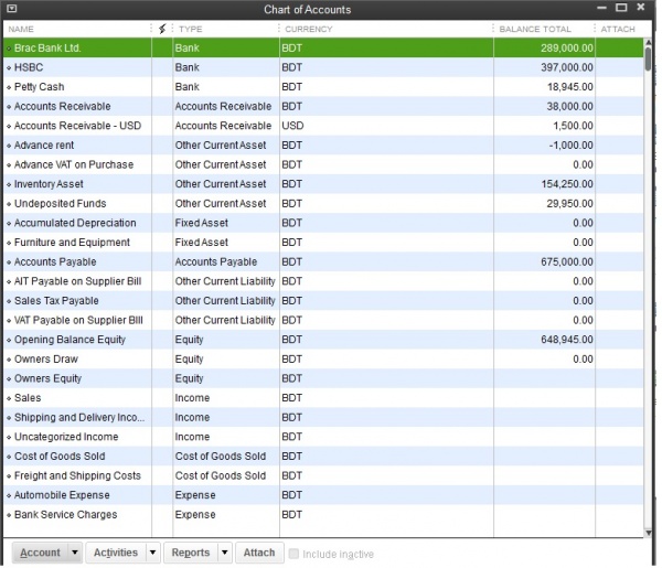 QuickBooks Software এ ব্যাবহৃত Account এর টাইপ সমূহ: