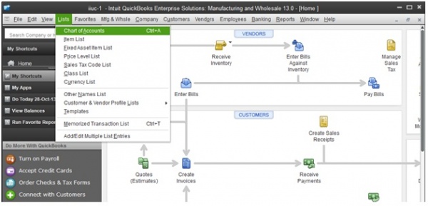 কোনও কারনে কোনও লেজারের নাম, কোড নম্বর কিংবা লেজারের Type পরিবর্তন করতে হতে পারে। এক্ষেত্রে List Menu ->Chart of Accounts এ আসুন।