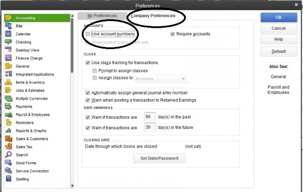 এবার Accounting->Company Preference এ আসুন এবং Use Account Numbers এর চেক বক্স এ টিক চিহ্ন দিন। তারপর OK ক্লিক করে বেরিয়ে আসুন।