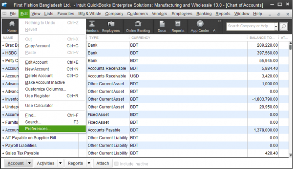 আসুন এবার আলোচনা করা যাক QuickBooks Software এ কিভাবে লেজার কোড ব্যাবহার করা যায়। কুইক বুকস সফটওয়্যার এ লেজার কোড ব্যাবহার করার অপশনটি সচরাচর Disable করা থাকে। এই অপশনটি ব্যাবহার করতে হলে প্রথমে একে Enable করতে হবে। এই অপশনটি Enable করার জন্য নিম্নোক্ত চিত্র অনুসরণ করে Edit মেনু হতে Preference এ ক্লিক করুন: