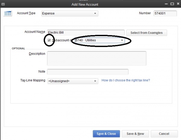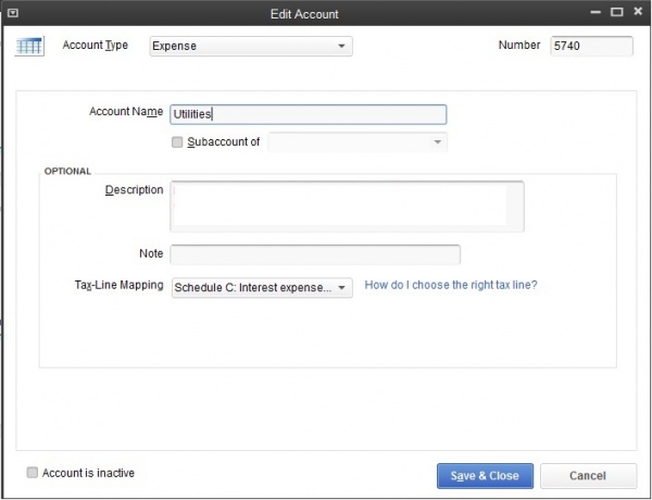 সাব একাউন্ট তৈরীর প্রথম ধাপে মাদার একাউন্ট তৈরী করে নিতে হবে। তারপর একে একে সাব-একাউন্ট সমূহ তৈরী করতে হবে। উপরোক্ত উদাহরণ অনুযায়ী প্রথমে আমরা মাদার একাউন্টটি তৈরী করবো। List menu-->Chart of Accounts-->Account-->New-->Expense সিলেক্ট করুন-->Continue তে ক্লিক করুন-->Number ফিল্ডে Account Code নম্বর লিখুন (যেমন: 5740)-->Account Name ফিল্ডে Utilities লিখুন এবং Save & Close বাটনে ক্লিক করুন।