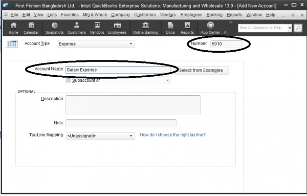 এবার List Menu-->Chart of Accounts-->Account-->New-->Expense সিলেক্ট করুন-->Continue বাটনে ক্লিক করুন-->Number ফিল্ডে 5010 লিখুন-->Account Name ফিল্ডে Salary Expense লিখুন-->Save & Close বাটনে ক্লিক করুন।