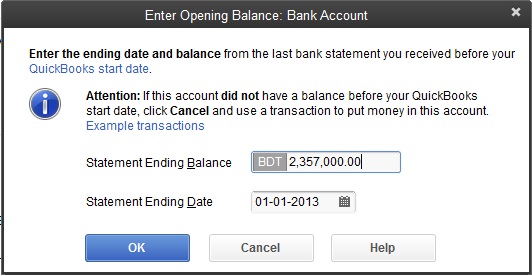 এবার Enter Opening Balance এ ক্লিক করুন। নিম্নোক্ত উইন্ডো আসবে। Statement Ending Balance এর ঘরে 23,57,000 লিখুন এবং Statement Ending Date এর ঘরে যেই তারিখের ব্যালেন্স সেই তারিখটি লিখুন যেমন: 01-01-2013 লিখুন।