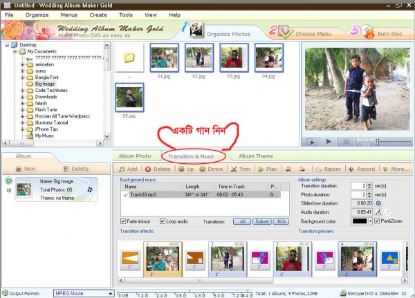 এবার Transition & Music Button বাটনে ক্লিক করে একটি গান নিন।