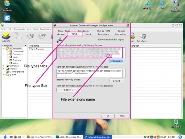 এবার যে মেনুবারটি আসল ওখানে থেকে File types ট্যবটি সিলেক্ট করুন।এবার যেখান লেখা আছে Automatically start downloading the following file types এর নিচে যে বক্স আছে তার নিচে মাউসের কারর্সাস দিয়ে একটা ক্লিক করুন।এরপর একটা স্পেস দিয়ে আপনার ফাইলের এক্সটেনশনের নামটা লিখে দেন। যেমন ধরুন আমি লিখেছি APK আপনারা আপনাদের ইছামত ফাইলের এক্সটেনশন লিখে দিবেন।