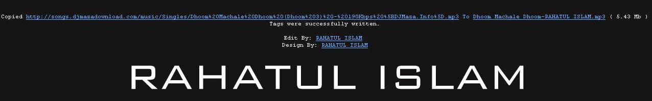 বুঝার জন্য আমি ইমেজের টেক্সট তা নিচে লিখে দিলাম ======================================================================================================================================================================================== Copied http://songs.djmazadownload.com/music/Singles/Dhoom%20Machale%20Dhoom%20(Dhoom%203)%20-%20190Kbps%20%5BDJMaza.Info%5D.mp3 To Dhoom Machale Dhoom-RAHATUL ISLAM.mp3 ( 5.43 Mb ) Tags were successfully written. Edit By : RAHTAUL ISLAM Design By : RAHATUL ISLAM (My Blog)