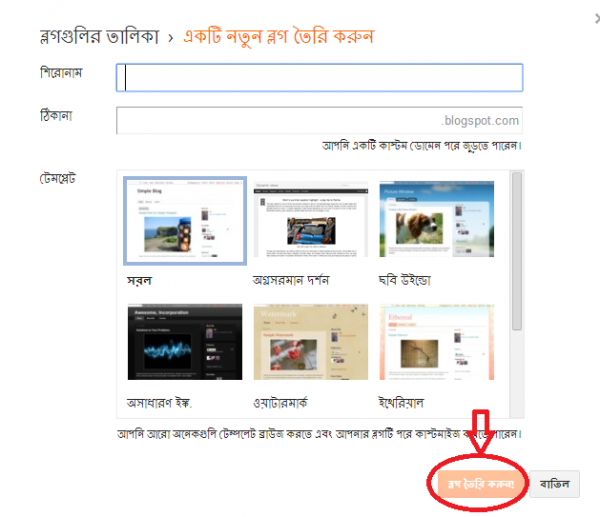 তারপর নিচের মতো অপশন আসবে। সেখানে আপনার ব্লগের নাম, ঠিকানা (যে এড্রেসে অন্যরা আপনাকে ওয়েবে দেখতে পাবে অর্থাৎ ওয়েব এড্রেস) এবং আপনার টেম্পলেট পছন্দ করুন।