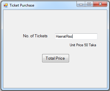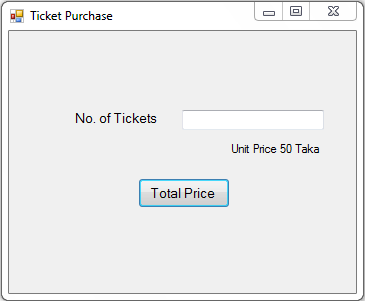 মনেকরুন আপনার প্রোগ্রামের ইউজার ইনপুট হিসেবে কতটা টিকিট কিনবে তার সংখ্যা দিবেন। প্রতিটি টিকিটের মূল্য যদি ৫০ টাকা হয় তাহলে আপনার প্রোগ্রামের কাজ হবে ইউজার ইনপুটের সাথে ৫০ গুন করে তা ইউজারকে দেখানো। প্রথমে আমি বুঝার সুবিধার্থে UI (User Interface) বিহাইন্ডে কোড করবো পরবর্তীটি OOP Concept ব্যাবহার করবো। তাহলে UI টি নিচের মতো কল্পনা করা যায়: