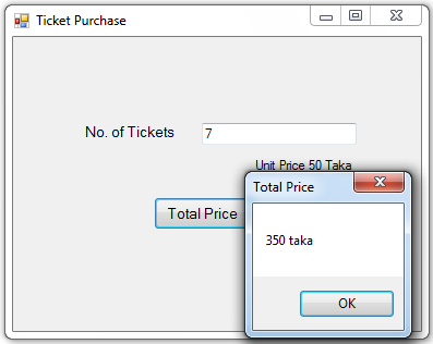 প্রোগ্রামটি এখন একটু বুঝার চেষ্টা করি, ইউজার ইনপুট হিসেবে 7 দিয়ে Total Price Button ক্লিক করলে তাকে একটা Message Box এ নিচের ছবির মতো Total Price 350 taka দেখিয়ে দিবে।