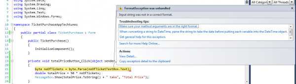 এই কোড থেকে আমরা দেখতে পাচ্ছি ইউজার যদি 255 বা এর চেয়ে ছোট সংখ্যা ইনপুট দেয় তাহলে প্রোগ্রামটি সঠিক ভাবে কাজ করবে (কারণ byte এর রেঞ্জ 255 পর্যন্ত), কিন্তু তার চেয়ে বড় সংখ্যা বা ইনপুট হিসেবে কোন String বা কোন ইনপুট না দিয়ে যদি ইউজার Total Price Button ক্লিক করে তাহলে কি হবে?