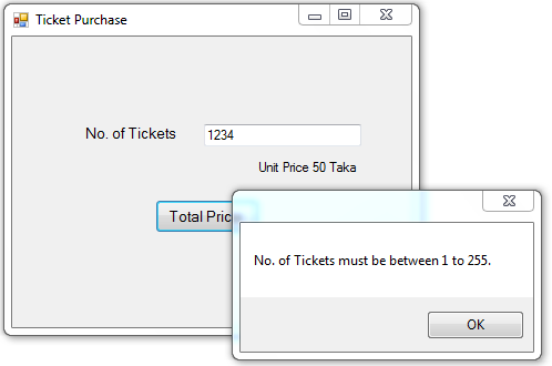 MessageBox.Show("No. of Tickets must be between 1 to 255.");