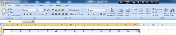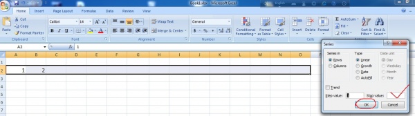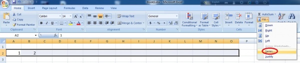আমরা নিচের ছবির মত দুইটি সেলে যথাক্রমে 1 ও 2 লিখি। আমি একই রো তে লিখলাম। আপনি ইচ্ছা করলে একই কলামে ও লিখতে পারেন। এখন লিখা দুইটি সেল সহ একই রো বা একই কলামে আরও কয়েকটি সেল সিলেক্ট করুন। তারপর চিত্রের মত Fill অপশন এ ক্লিক করে Series সিলেক্ট করুন।