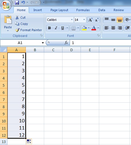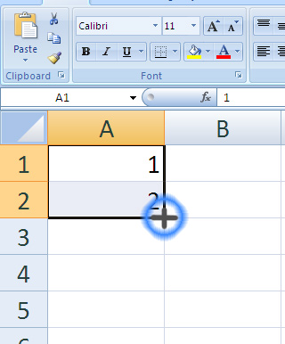 অন্য পদ্ধতিঃ এখন আমরা আসলে সবাই যেভাবে Fill অপশন এর কাজ করে অর্থাৎ সহজ পদ্ধতি টা দেখবো। যেকোনো কলামে বা রো তে 1 ও 2 লিখি। এখন 1 ও 2 লিখা সেল দুইটি সিলেক্ট করে ছবির মত নিচের ডানপাশের কোনায় + চিহ্ন আসলে মাউসের রাইট বাটন ক্লিক করা অবস্থায় নিচের কলাম বরাবর ড্রাগ করে নিচে নামাই আমাদের যতটা দরকার।