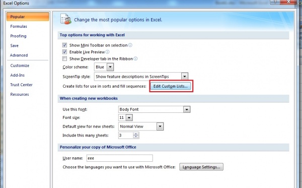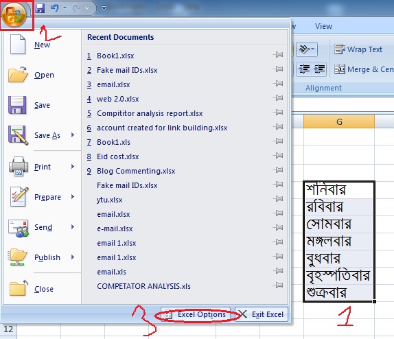 প্রথমে উপরের ছবির মত বাংলা সাতদিনের নাম লিখি এবং তা সিলেক্ট করি। অফিস বাটন এ ক্লিক করে যে বক্স আসে সেখান থেকে চিত্রের মত Excel Option এ ক্লিক করুন। তারপর নিচের চিত্রের মত Edit Custom lists এ ক্লিক করি।