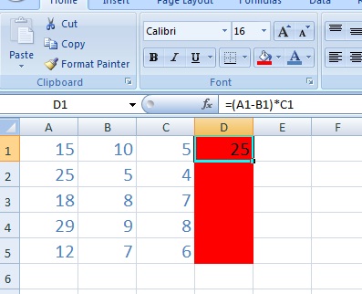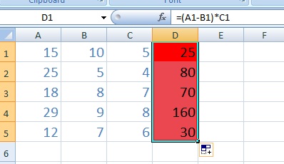 নিচে আমরা Fill অপশন এর আরেকটি উদাহরণ দেখবো। A,B,C কলামে আমাদের কিছু ডাটা আছে। D1 কলামে আমরা =(A1-B1)*C1 এই ফর্মুলা দিলাম এবং তার ফলাফল পেলাম।
