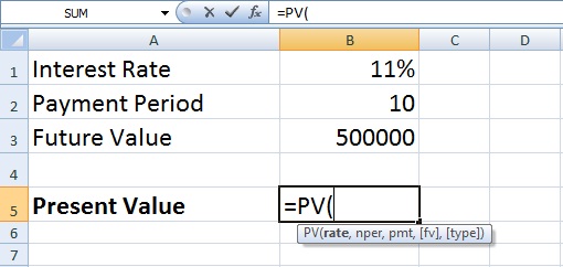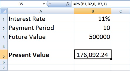এখন আমরা B5 সেলে কার্সর রেখে ফর্মুলাবার এ =PV(B1,B2,0,-B3,1) লিখে ইন্টার চাপি। যেহেতু আমরা মাসিক কোন Installment দিবো না তাই ০, B3 এর পূর্বে - দেওয়ার কারন হল যেহেতু এটা কিছুটা সপ্নের মত, কল্পনাপ্রসূত তাই FV,PV, PMT বের করার পূর্বে টাকার পরিমান এর পূর্বে - চিহ্ন দিতে হয় ( এই ব্যপার এ আমি আর বিস্তারিত জানিনা, কেও জানলে অবশ্যই জানাবেন কৃতজ্ঞ থাকব)। – চিহ্ন না দিলেও হবে তবে রেজাল্ট লাল কালারে দেখাবে।আর এখানে ১ বা ০ দেওয়ার মধ্যে কোন পার্থক্য নাই যেহেতু মাসিক কোন Installment নাই। ১০ বছর মেয়াদ শেষ হলেই আমরা পাঁচ লক্ষ টাকা পাবো।