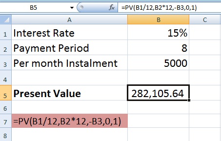 তাহলে আমরা চিত্রের মত ডাটা টাইপ করে B5 সেলে কার্সর রেখে =PV(B1/12,B2*12,-B3,0,1) লিখে ইন্টার দেই। তাহলেই আমরা আমাদের কাংখিত ফলাফল পাবো। যেহেতু আমরা মাসিক কিস্তি দেব তাই হিসাবটা ও মাসিক ভিত্তিতে করতে হবে। আর এইজন্যই মাসিক সুদ বের করার জন্য B1 কে ১২ দ্বারা ভাগ , মোট কতটি কিস্তি টা বের করার জন্য ৮ বছরকে অর্থাৎ B2 কে ১২ দ্বারা গুন করা হয়েছে। B3 এর পূর্বে ঐতিহাসিক সেই - চিহ্ন , যেহুতু ঋণ পরিশোধ হতে হতে অবশেষে ০ হয়ে যাবে তাই FV= 0, আর ধরে নিলাম আমরা কিস্তি প্রতি মাসের প্রথমে দিবো তাই 1 দিলাম। কিস্তি যদি প্রতি মাসের শেষে দেই তাহলে আমরা কম টাকা পাবো। অর্থাৎ PV কমবে। আপনারা করে দেখতে পারেন।