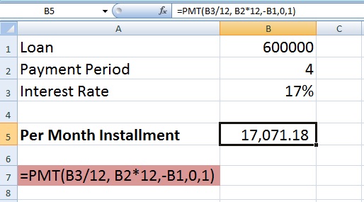 উপরের চিত্রের মত B5 সেলে কার্সর রেখে ফর্মুলা বার এ =PMT(B3/12, B2*12,-B1,0,1) লিখে ইন্টার দেই। তাহলে আমরা পেয়ে গেলাম মাসিক কিস্তি ১৭০৭১.১৮ টাকা। যদি আমরা এই ফর্মুলা =PMT(B3/12, B2*12,-B1,0,০) দিতাম অর্থাৎ কিস্তি প্রতি মাসের শেষে দিবে তাহলে মাসিক কিস্তির টাকার পরিমান বাড়ত।