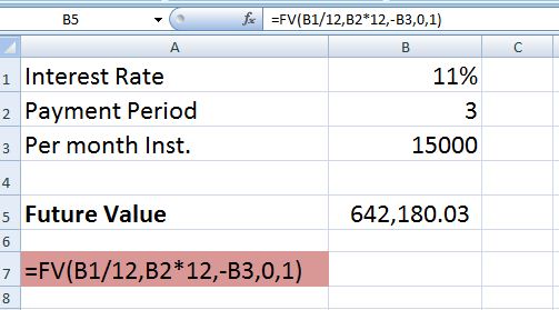 অর্থাৎ কেও যদি ১১% হার সুদে প্রতি মাসে ১৫০০০ টাকা করে ব্যাংক এ রাখে। ৩ বছর পরে সে কত টাকা পাবে? উপরের চিত্রের মত B5 সেলে কার্সর রেখে ফর্মুলা বার এ =FV(B1/12, B2*12,-B3,0,1) লিখে ইন্টার দেই। তাহলে আমরা পেয়ে গেলাম ৬,৪২,১৮০.০৩ টাকা।