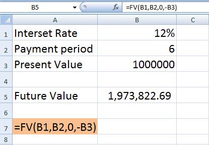 উপরের চিত্রের মত B5 সেলে কার্সর রেখে ফর্মুলা বার এ =FV(B1, B2,-B3,0) লিখে ইন্টার দেই। তাহলে আমরা পেয়ে গেলাম ১৯,৭৩,৮২২.৬৯ টাকা। যেহেতু এখানে মাসিক কোন ইন্সটলমেন্ট নাই তাই ১২ দিয়ে গুন ভাগ করার কাহিনী করা লাগবে না।