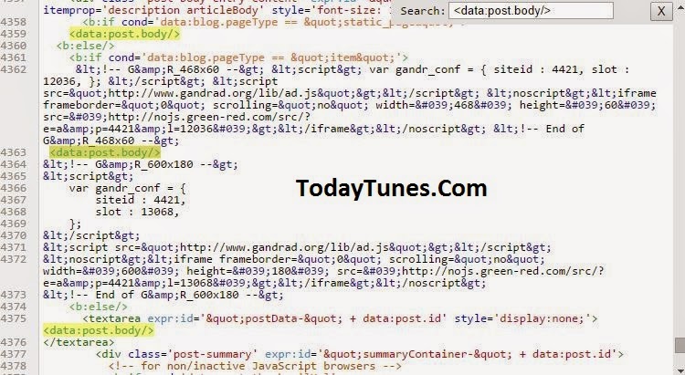 এবার আপনার ব্লগের টেমপ্লেটটা ব্যাক আপন করে নিন। এরপর টেমপ্রটে যান> এডিটে ক্লিক করুন।বক্সের ভিতর ক্লিক করে Ctrl+F এ ক্লিক করুন। দেখবেন ডান কোনায় একটা ছোট বক্স অপেন হবে। ওখানে <data:post.body/>এই লিখাটা কপি করে পেষ্ট করুন।এন্টার চাপুন। দেখবেন অনেকগুলো <data:post.body/> পাবেন। মনে রাখবেন প্রথম <data:post.body/> তে কিন্তু অ্যাড কোডগুলো পেষ্ট করবেন না। স্বভাবিকভাবে ৩য় <data:post.body/> এর উপরে অ্যাড কোড দিলে সেইটা টাইটেলের ঠিক নিচে শো করবে। আর ৩ য় <data:post.body/> এর নিচে অ্যাড কোডগুলো পেস্ট করলে সেটি ঠিক টিউনের নিচে শো করবে। কোন কোন ব্লগে ২ য় <data:post.body/> এ অ্যাড কোডগুলো বসানো লাগতে পারে, কারণ এইটা নির্ভর করে আপনার ব্লগের টেমপ্লেটের উপর। সেক্ষেত্রে অ্যাড কোডগুলো আপনাকে ইউস করে দেখতে হবে। ছবি দিলাম ছবিটি দেখতে পারেন।