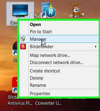 এবার এগুলি পরিবর্তন করতে চাইলে প্রথমেই ডেস্কটপে Computer/My Computer /This PC আইকনে রাইট ক্লিক করে Manage এ ক্লিক করুন নিচের ছবির মত। উইন্ডোস এক্সপি ব্যাবহারকারীদের জন্য ভিন্নও হতে পারে।