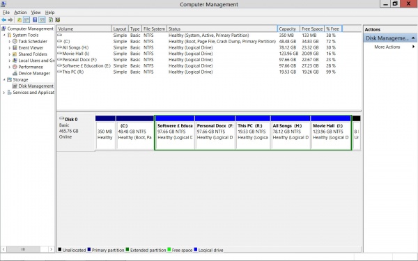 ছবিতে বাম দিকে দেখানো Disk Management এ ক্লিক করুন অথবা তার উপর দিয়ে Storage লেখাতে Double Click করে Disk Management এ ক্লিক করুন।একই কথা। তাহলে নিচের মতো আপনার ড্রাইভের সমস্ত ইনফরমেশন দেখাবে।