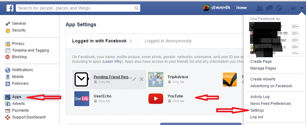 আসুন সেইটা দেখা যাক,,,,,,,,,,,,, প্রথমে আপনার এ্যাকউন্টের সেটিং এ ক্লিক করেন। এরপর ডান বাড়ে Apps অপশন পাবেন ঐটাকে ক্লিক করেন।বুঝার সুবিধার জন্য আসি স্ক্রিন নট দিয়ে মার্ক করে দিলাম।মনে কুরন আপনার ইনস্টলকৃত এ্রাপটি হলো Youtube তাহলে ইউটিউব রিমোভ করার জন্য Youtube এর পাশে দেখুন একটা ক্রস চিহ্ন আছে। ঐটায় ক্লিক করুন।
