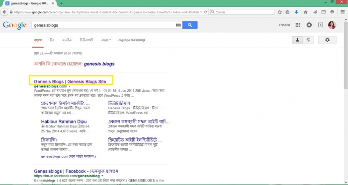 সার্চ ইঞ্জিনে এর রেজাল্ট যখন আমরা ব্রাউজারে দেখি তখন পেজের টাইটেল থাকবে সবার আগে । যেমন আমরা যদি genesisblogs লিখে গুগলে সার্চ দেই তাহলে আমরা নিম্নের চিত্র অনুযায়ী দেখতে পারব ।