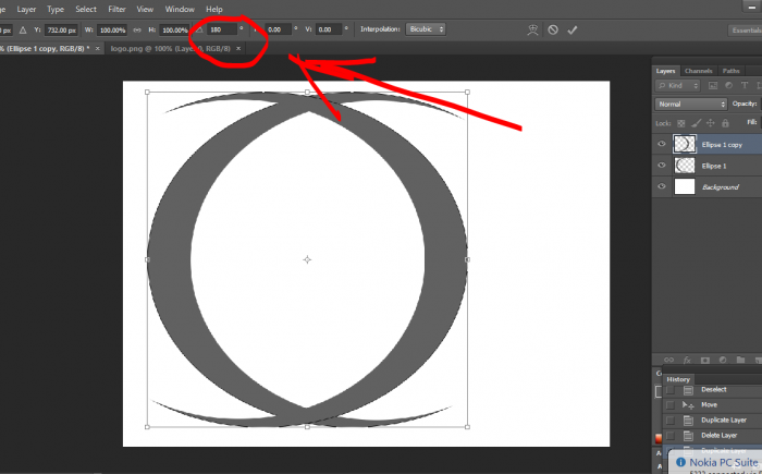 ঘোরানোর কাজ টা নিখুত করার জন্য মাউস দিয়ে না ঘুরিয়ে ছবিতে দেখানো ফর্মে 180 টাইপ করুন (১৮০ দিগ্রি ঘোরানোর জন্য)। ব্যাস এবার মাউস দিয়ে লেয়ারটা ড্রাগ করে ডিম্বাকার বানান।