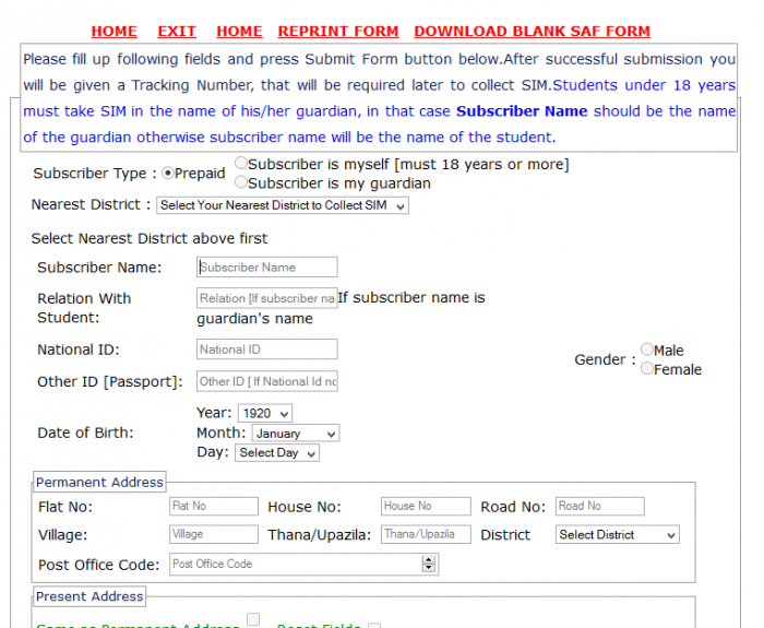* যার নামে রেজিষ্ট্রেশন করা হয়েছে তিনি নিজে না যেতে পারলে অনলাইন থেকে SAF প্রিন্ট করে তা পূরণ করে নিয়ে যেতে হবে । SAF ফর্ম http://bornomala.teletalk.com.bd/public/saf_form.pdf লিংক থেকে ডাউনলোড করে পূরণ করতে হবে । বা, নিকটস্ত কাস্টমার কেয়ার থেকে এই ফর্ম পাওয়া যাবে ।