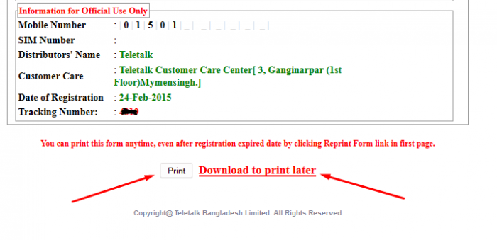 তারপর আপনি যেই আপনার পূরণকৃত ফর্মটি দেখতে পাবেন । এই ফর্মটি সিম তোলার সময় লাগবে । তাই এটি প্রিন্ট করে রাখতে পারেন বা ডাউনলোড করে পরে প্রিন্ট করলেও হবে ।