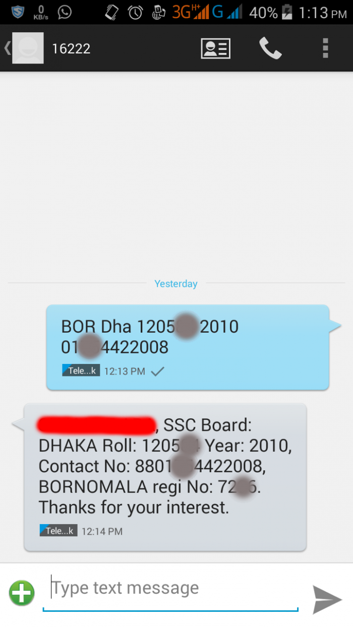১. প্রথমে যেকোন টেলিটক সিম থেকে Bor Board Roll Passing_year Mobile no লিখে 16222 এ SMS করতে হবে । [ এখানে, Roll নাম্বার এস.এস.সি. – এর ,Passing Year এস.এস.সি পাশের সাল , মোবাইল নাম্বার আপনার নিজের যেকোন নাম্বার দিবেন (পরবর্তীতে এই নাম্বারে মেসেজ আসবে) ]