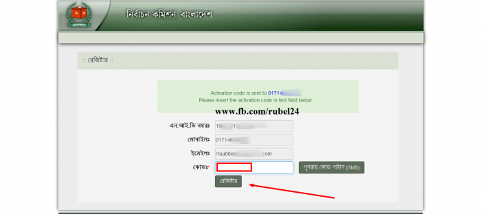 ফরম টি সঠিক ও সফল ভাবে রেজিস্টার করার পর দেখুন আপনার মোবাইলে ভেরিফাই কোড এসেছে ও ব্রাউজারে ঐ কোড সামমিট করার অপশন এসেছে , নিচের ছবির মত স্থানে আপনার মোবাইলের ভেরিফাই কোড বাসান ও রেজিস্টার বাঁটনে ক্লিক করুন ।