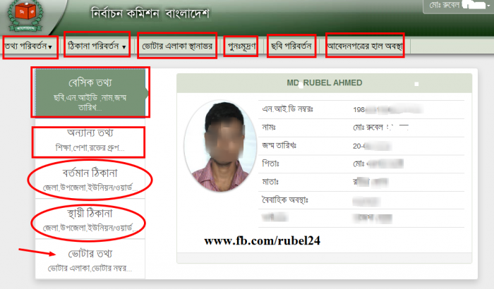 এবার দেখুন আপনার নির্বাচন কমিশনের কাছে থাকা আপনার সকল ডাটাবেজ আপনার সামনে হাজির 🙂 এবং নিচের যেকোন অপশনে আপনার দরকার অনুযায়ী অপশনে ক্লিক করুন আর তথ্য হালনাগাদ করুন এবং আপনার জাতীয় পরিচয়পত্রের ছবি পরিবর্তন সহ অনেক কিছু পরিবর্তন করুন।
