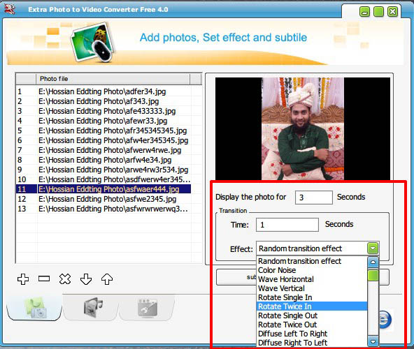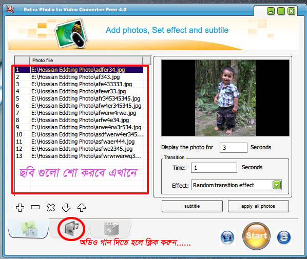 আর দেখানো জায়গায় ক্লিক করে আপনার পছন্দের গানটি দিয়ে দিন। আর Effect বক্স থেকে এক একটি ছবির জন্য এক এক রকম ইফেক্ট সিলেক্ট করুন।