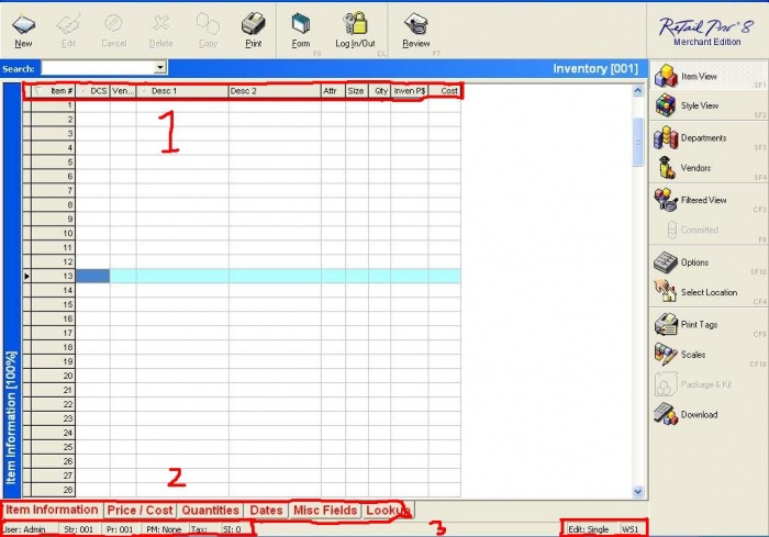 নিচের চিত্রটি দেখুন, এটা হলো Merchandise এর অধীনে Inventory field, এখানে আমি তিন জায়গায় লাল রং দিয়ে দাগ দিয়েছি। তার প্রথমটি হলো Item Header, ২ নং হলো Sheets বা Page, ৩ নং হলো কিছু তথ্য।